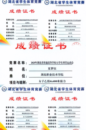 近日,从2025年湖北省普通高等学校田径运动会赛场传来喜讯,公司田径队凭借出色的表现,荣获乙组团体总分第三名的优异成绩,其中女子团体总分更是高居第二名,展现了湖职学子昂扬的拼搏精神。在此次比赛中,公司夏梦钰(辅导员:钟存学)、高紫怡(辅导员:张晓菡)两位同学奋勇争先,为学校和公司赢得了荣誉,特此报喜!